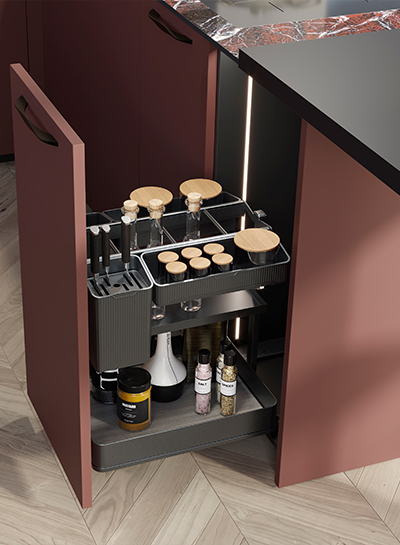 Advanced accessories display items rather than simply storing them. High-quality kitchen drawers with full-extension drawer slides improve visibility of each item, allowing users to find what they need instantly.