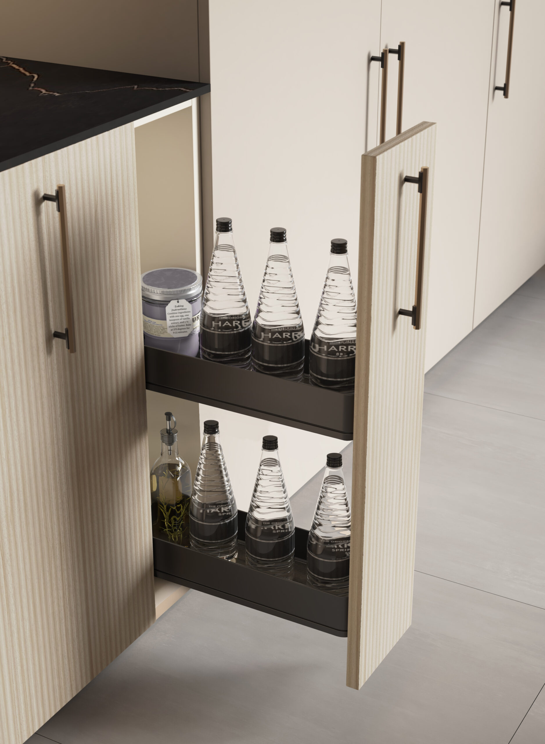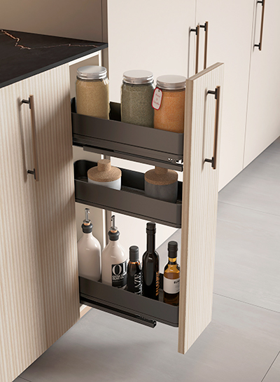 The overall style of the space determines the hardware. While brass fits a rustic style, aluminum is better suited for modern and minimalist kitchens. However, although the latest trends offer innovative solutions, fashion should never compromise the long-term functionality of the kitchen storage system.